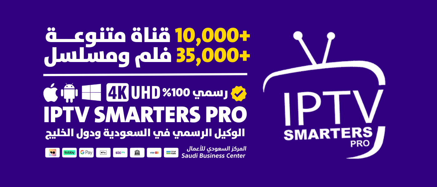 الوكيل الرسمي والحصري لاشتراكات IPTV Smarters Pro في المملكة العربية السعودية ودول الخليج، مع بث بجودة 4K لجميع القنوات والأفلام والمسلسلات.